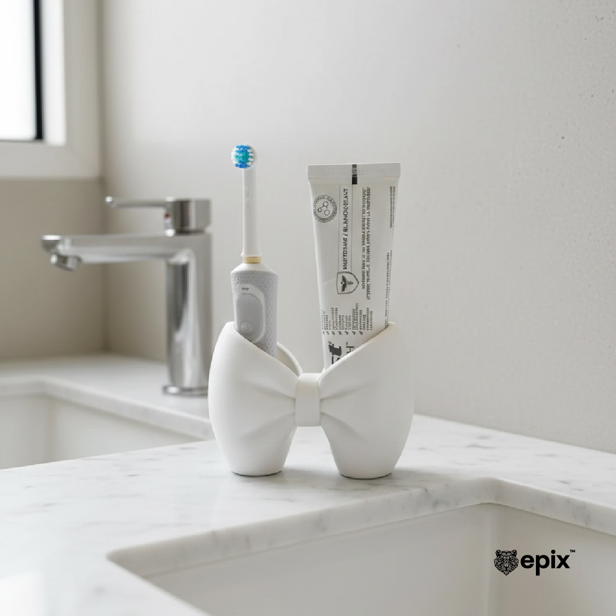 Mbajtëse elegante në formë fjongoje e cila kombinon stilin modern me funksionalitetin për të organizuar hapësirën tuaj me plot klas. Kjo mbajtëse universale është perfekte për të mbajtur furçat e dhëmbëve dhe pastën në tualet ose për të rregulluar furçat e makijazhit dhe mjetet e punës në tavolinën tuaj. E punuar me një dizajn minimalist dhe teksturë mat që përshtatet me çdo ambient kjo mbajtëse është zgjedhja ideale për ata që duan rregull dhe estetikë në një produkt të vetëm.