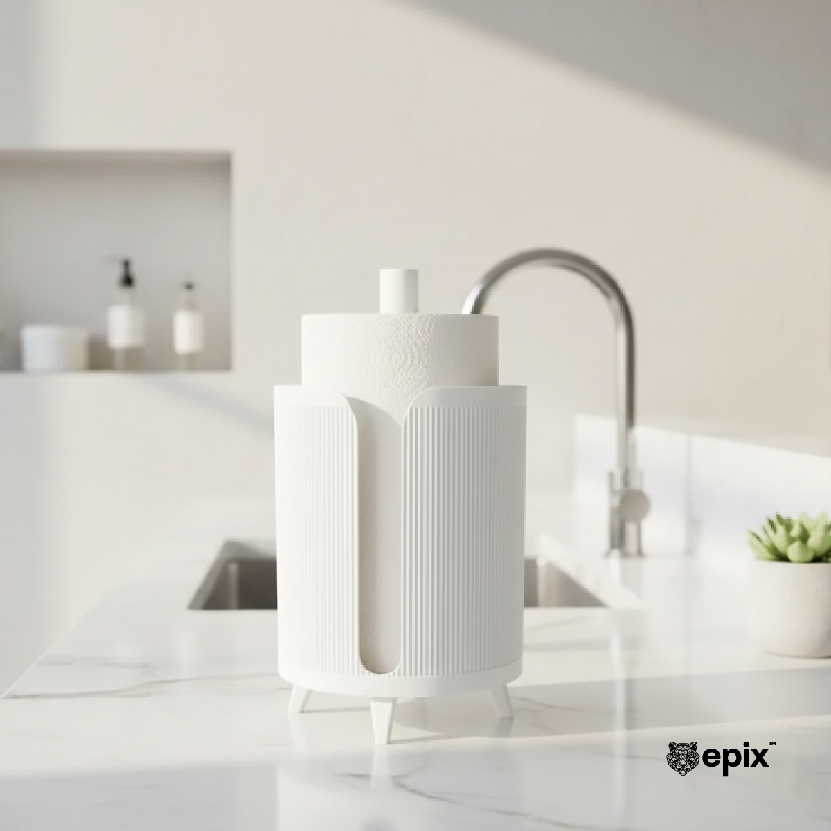 Mbajtëse moderne për letra kuzhine me dizajn minimalist dhe teksturë elegante. E pajisur me këmbëza të vogla për stabilitet, kjo mbajtëse mbron letrën nga lagështia dhe dekoron banakun tuaj me një stil të pastër e bashkëkohor.