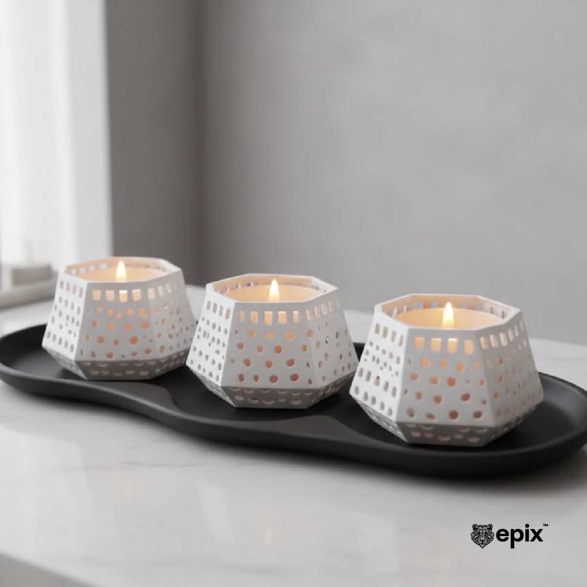 Mbajtëse qirinjsh VOID Glow me një dizajn gjeometrik të ndërlikuar dhe vrima dekorative që krijojnë një lojë mahnitëse dritë-hije në ambientin tuaj. Ky set përfshin tre mbajtëse qirinjsh me ngjyrë të bardhë të pastër, të vendosura mbi një bazë të zezë me forma fluide, duke ofruar një kontrast elegant dhe modern që i jep ngrohtësi dhe karakter çdo tavoline apo culli dritareje.